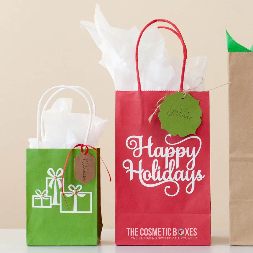 These bags are offered in paper, fabric, and biodegradable plastic materials. Moreover, you can have them printed with offset, digital, flexo, or screen printing options, just like your Large Christmas Boxes. In addition to these, you can also enhance the finishing by using our add-ons.