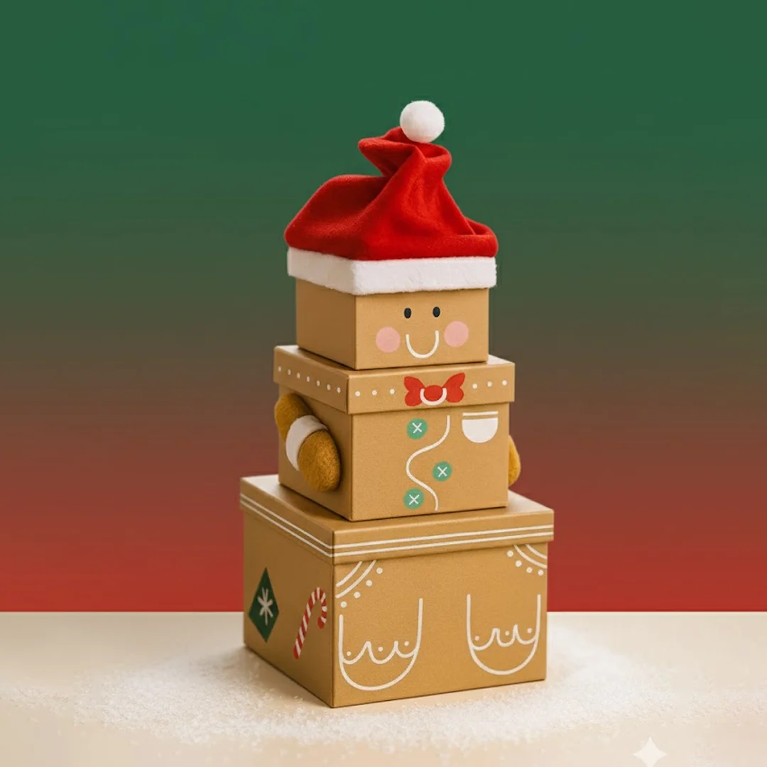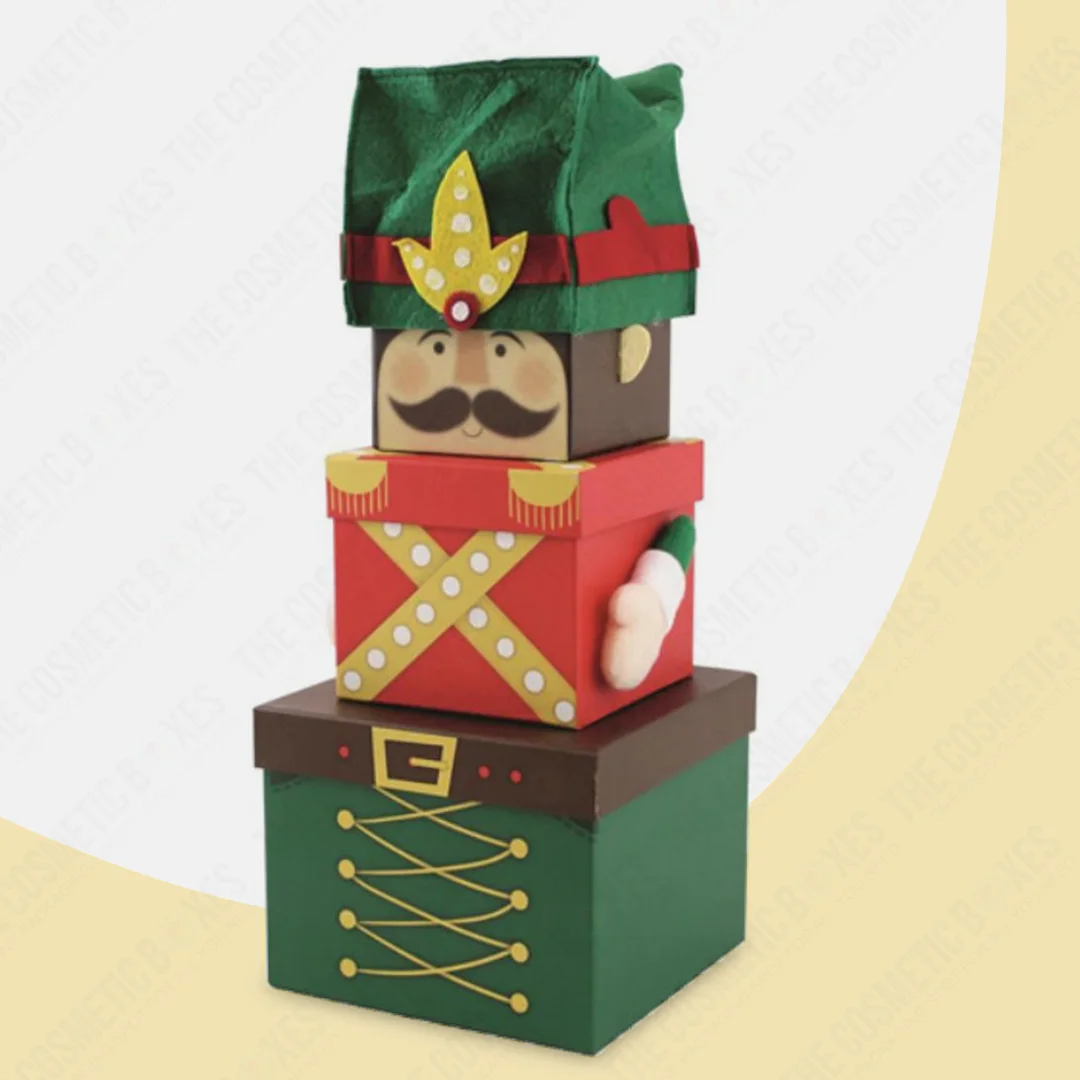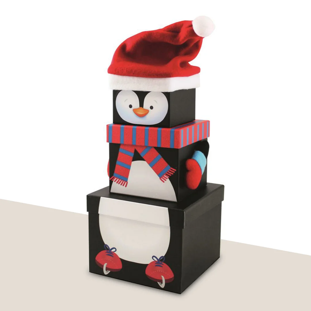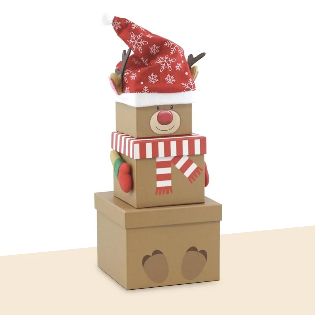 Christmas Stacking Boxes are a set of multiple boxes in different sizes that neatly fit in the box or “stack” over one another to form a tiered gift tower or a pyramid—often in the shape of a Christmas character like Santa or a Snowman. Each box can hold a separate item, creating a layered unboxing experience that’s both surprising and aesthetic.